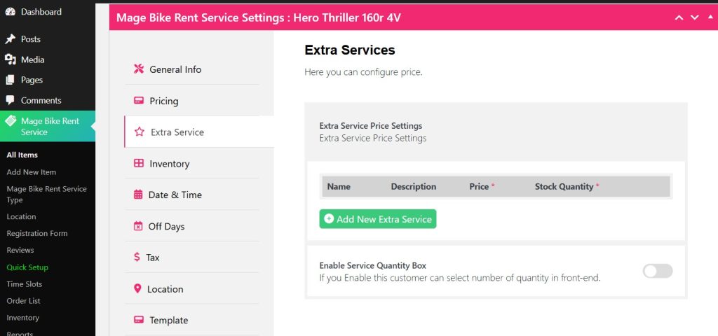 After adding your Pricing type for your rental service, you can add more services from the Extra Services tab.
