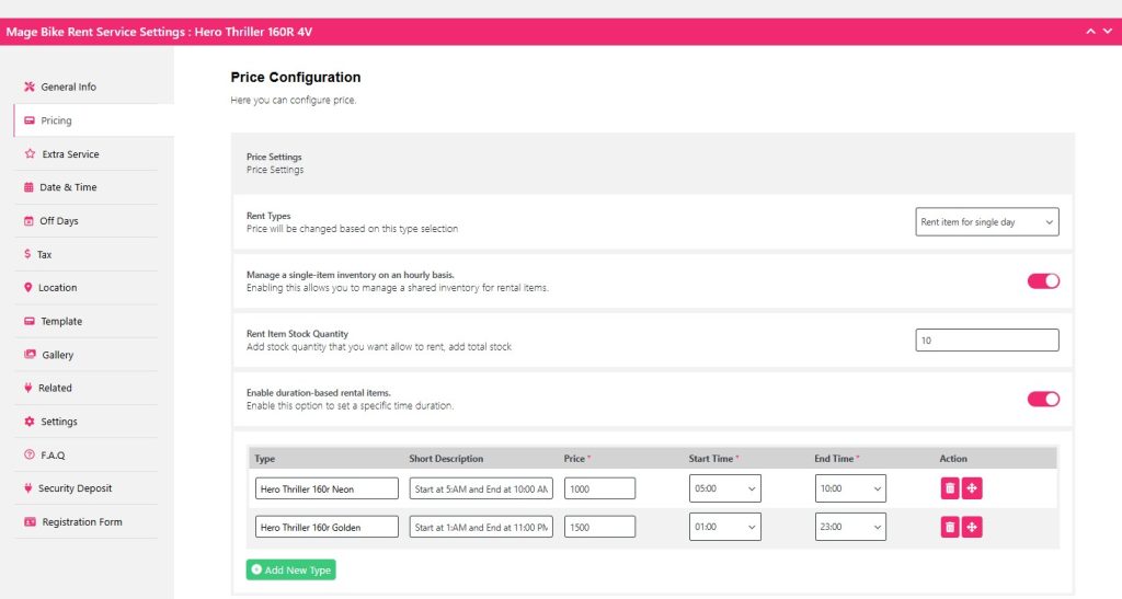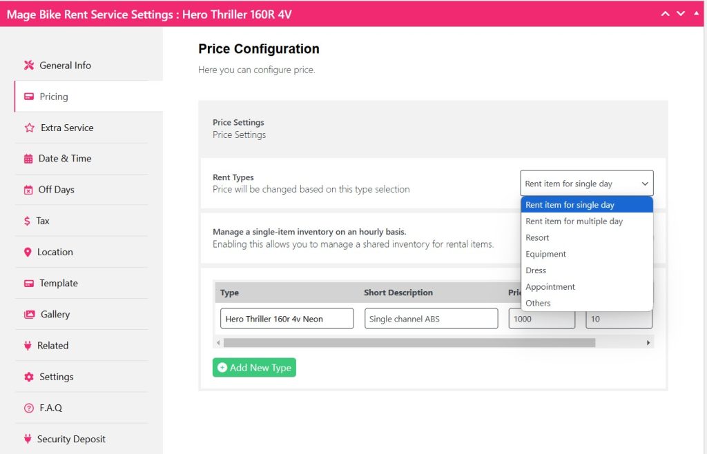 If you want to add more types as a variant with different prices, click the Add New Type button.