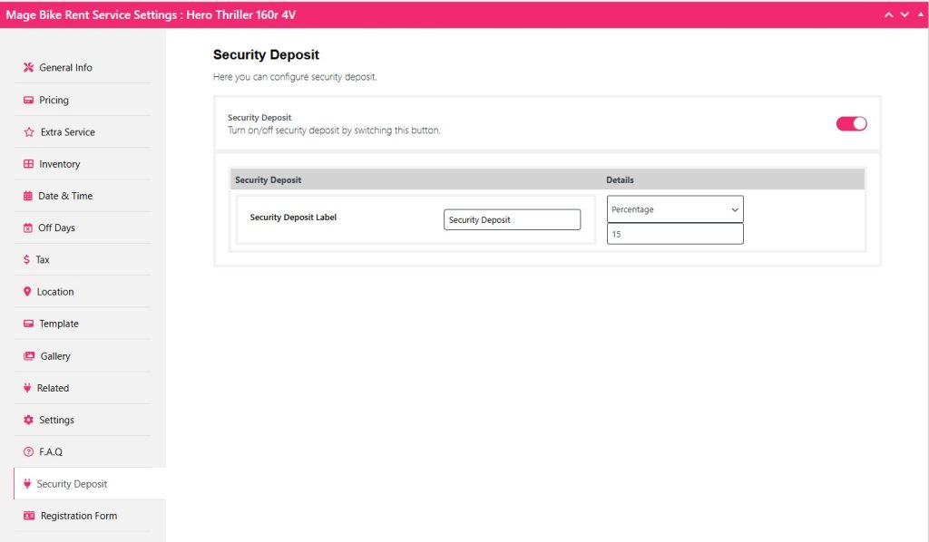 Toggle Security Deposit and add the Label and amount in percentage or fixed depending on your policy.