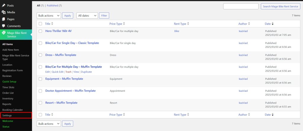 To configure your Rental system globally, navigate to the Settings option under your WpRently plugin.