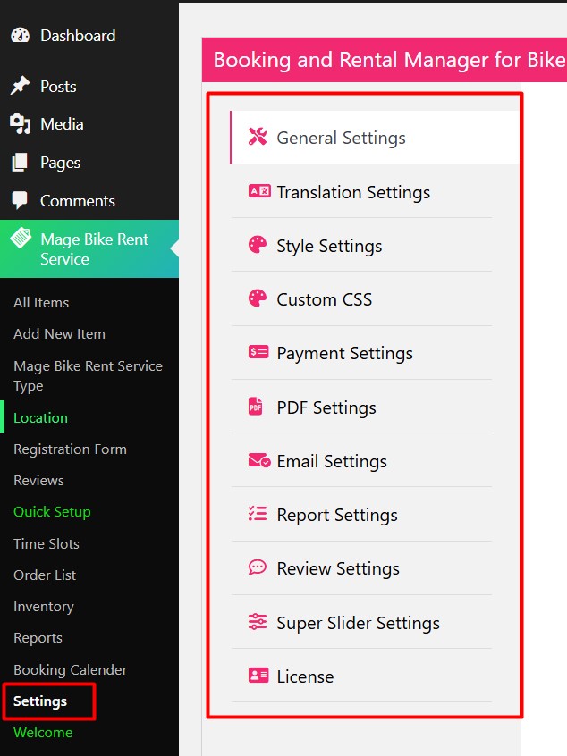 - General Settings – Here you can configure all the general configuration of your rental items.