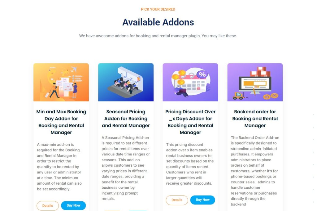 Seasonal Pricing Add-on – Allows different pricing for different date ranges, changing rental costs based on seasonal demand.